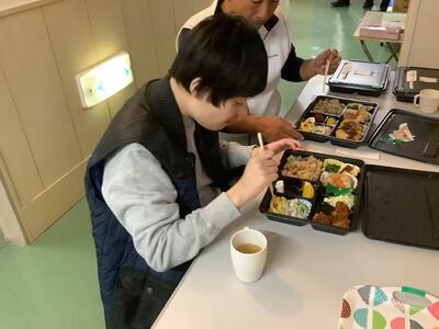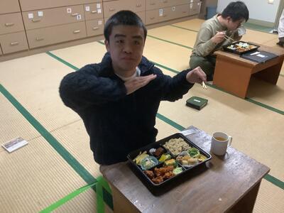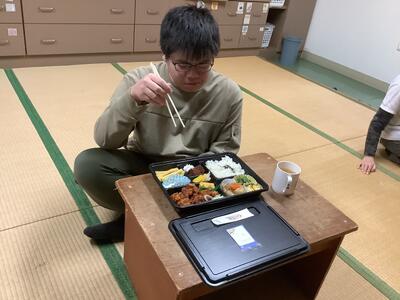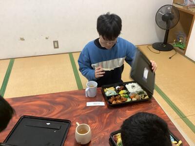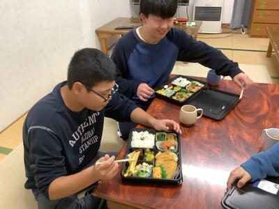 12/1(月)に北棟1階食事会がありました。今学期の食事会は「きのこ茶屋」のお弁当を注文し、棟内で食事をしました。感染症の流行もあり、いくつかのグループに分かれて食べました。